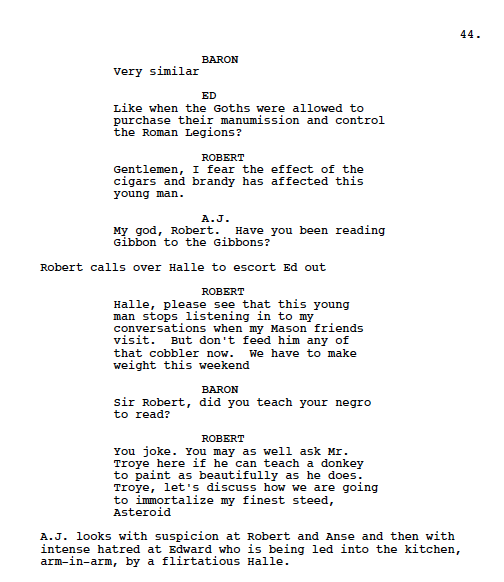 In my new biopic about Edward Dudley Brown, a real former slave who won the Belmont Stakes and then trained four Kentucky Derby winners during Reconstruction, Ed gets the better of some Germans who have come to the farm to mate their broodmare to the most prolific stud horse of the 19th century, Lexington.  The German Baron starts explaining that negroes make better jockeys because they are more animal in nature. Ed, having read Gibbon’s The Rise and Fall of the Roman Empire, uses the history I mentioned above to zing them: